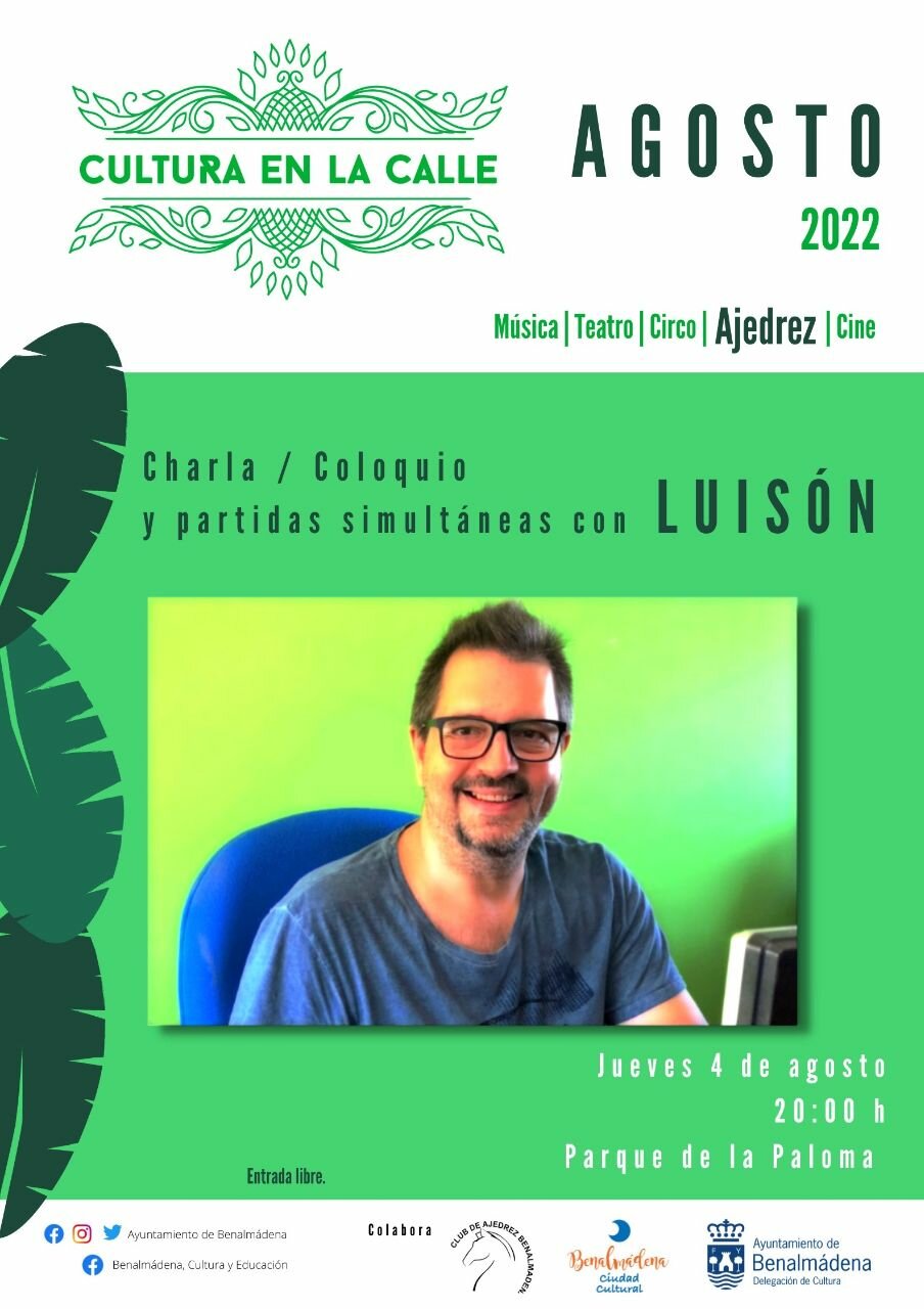 El maestro de ajedrez Luis Fernández Siles ‘Luisón’ ofrecerá una charla-coloquio y una sesión de partidas simultáneas con hasta 15 tableros este jueves, 4 de agosto, en el parque de La Paloma. La actividad, dentro del programa veraniego ‘Cultura en la Calle’, comenzará a las 20:00.